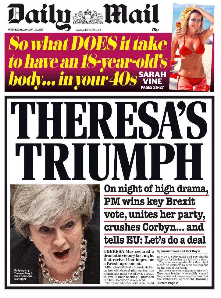 En témoigne la « une » du Daily Mail (pro-Brexit) du 30 janvier 2019 « Le triomphe de Theresa May » au lendemain du vote du « plan B » par la Chambre des communes qui n’est donc qu’un plan A sans backstop.